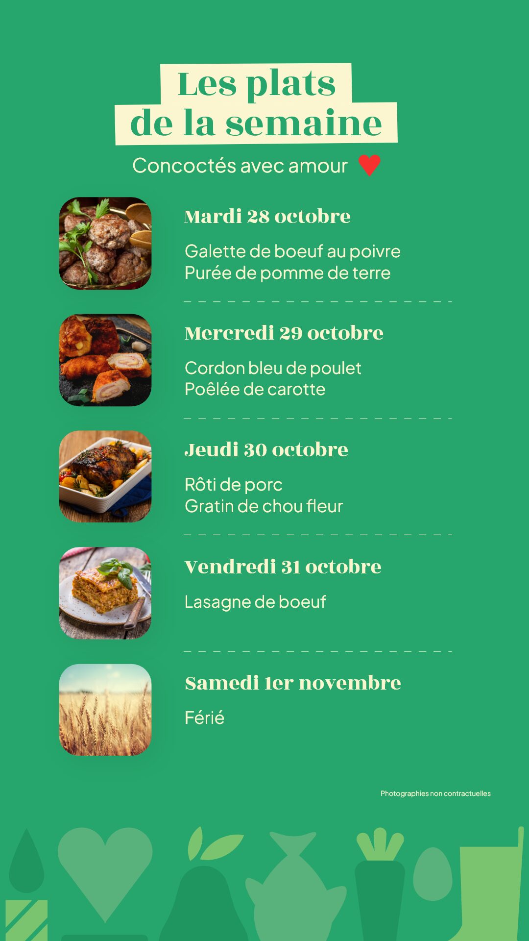 MARDI : Galette de boeuf au poivre / Purée de pomme de terre MERCREDI : Cordon bleu de poulet / Poêlée de carotte JEUDI : Rôti de porc / Gratin…