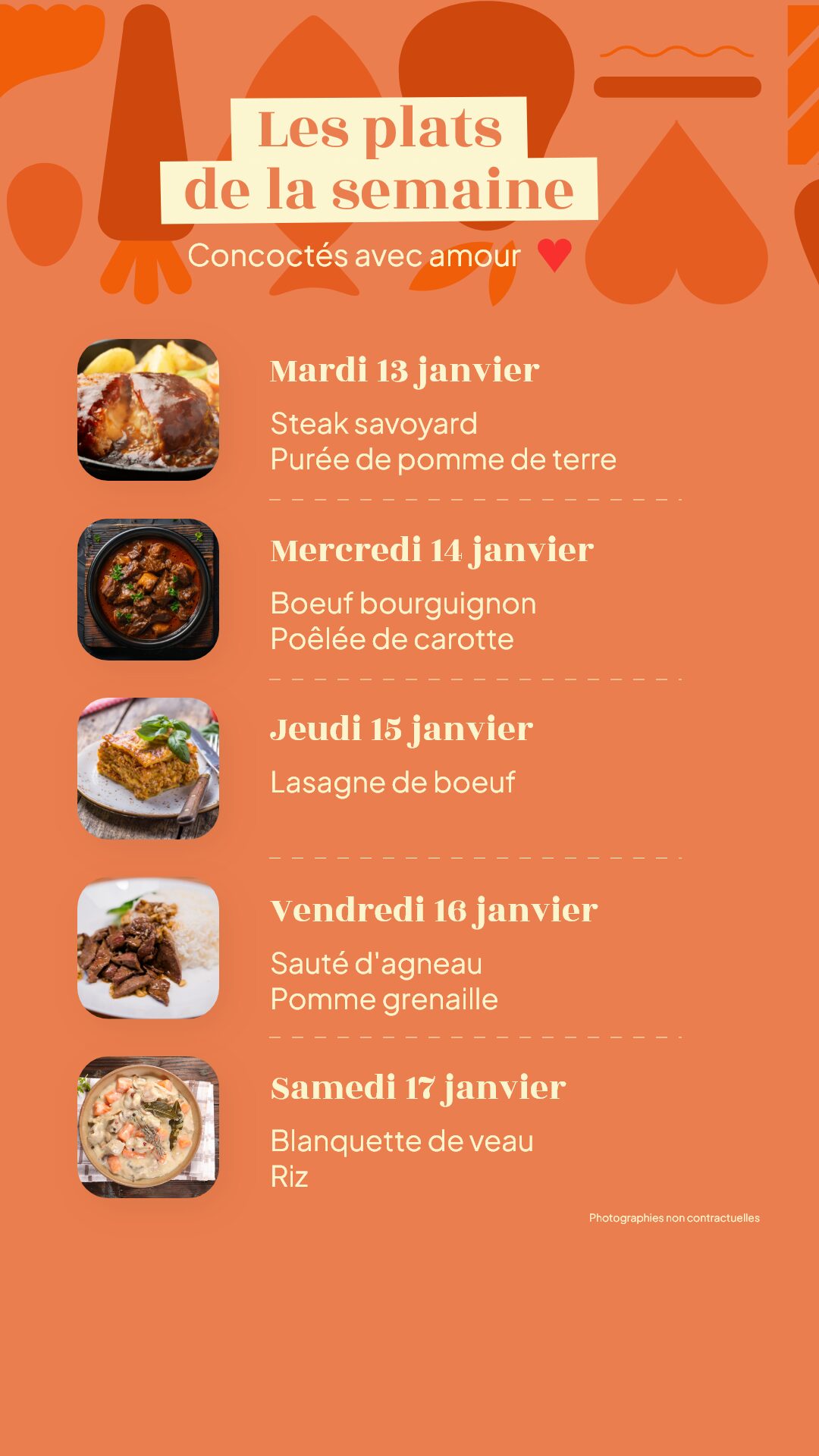 MARDI : Steak savoyard / Purée de pomme de terre MERCREDI : Boeuf bourguignon / Poêlée de carotte JEUDI : Lasagne de boeuf VENDREDI : Sauté d'agneau / Pomme grenaille…